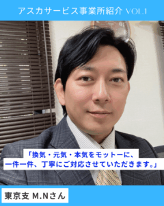 今回は、東京支店のM.Nさんに、支店の特徴やお仕事にかける想いについてお話を伺いました。