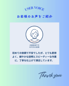 ◆「初めての依頼で不安でしたが、とても愛想よく、細やかな説明とスピーディーな作業に、丁寧な仕上げで満足しています。」